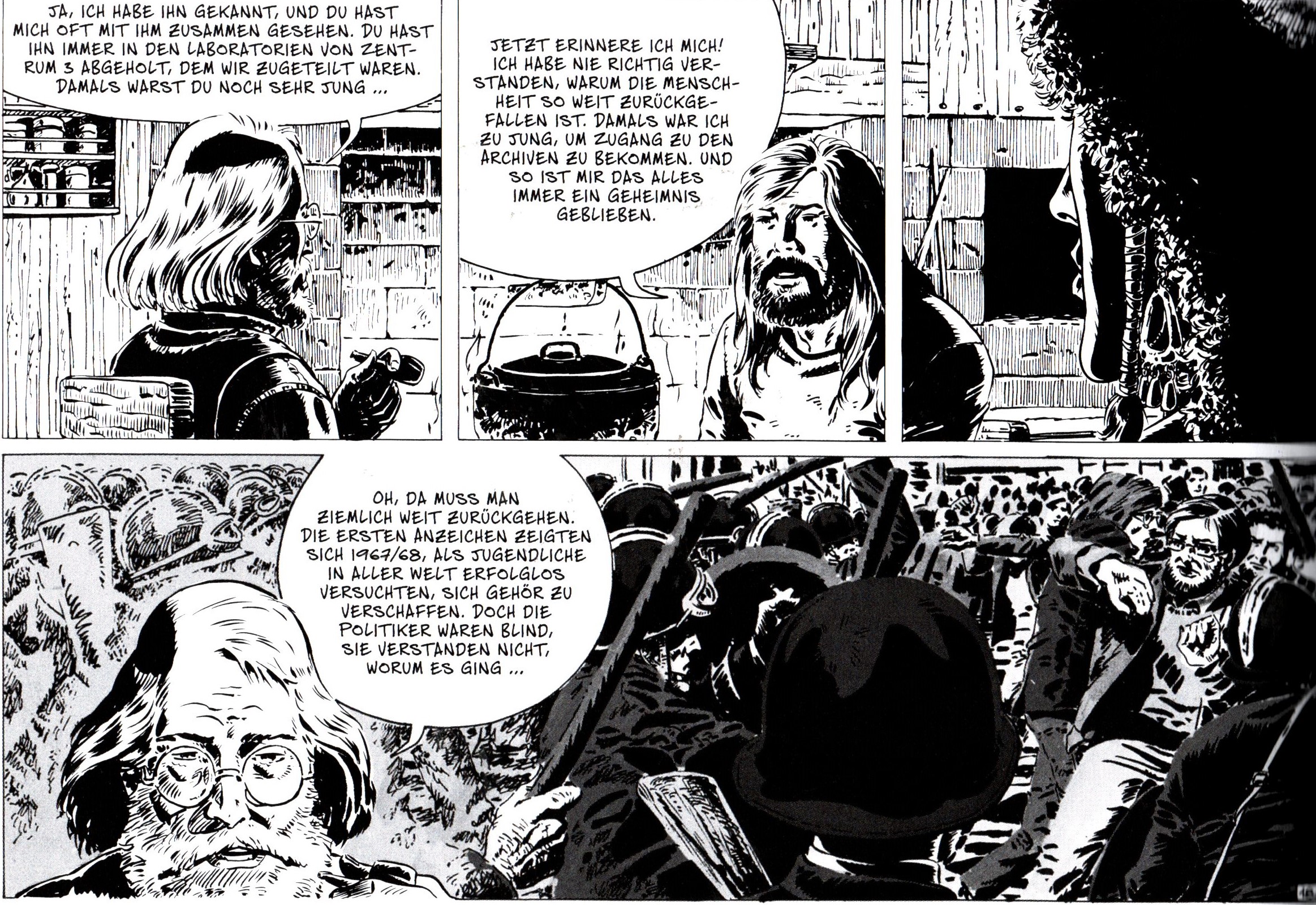 Wie es dazu kam, dass die Menschheit in primitiven Verhältnissen lebt, in der das Recht des Stärkeren gilt, erzählt Auclair als Rückblende in seiner zweiten Story Der Clan der Zentauren. Absolut untypisch für die Veröffentlichung in einem eher konservativen Comic-Magazin, thematisiert Auclair die Proteste der 68er-Bewegung, die gegen den kriegstreibenden Imperialismus der Großmächte demonstrierten.