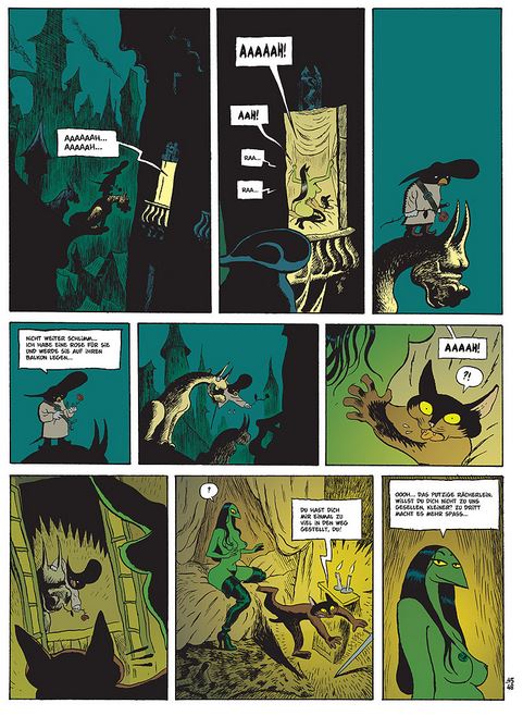 Was die atemlos zeichnenden und textenden französischen Comic-Stars Joann Sfar (Die Katze des Rabbiners, Gainsbourg) und Lewis Trondheim (A.L.I.E.E.N., Mickey’s Craziest Adventures) hier gemeinsam mit Christophe Blain (Isaak der Pirat, Blueberry: Das Trauma der Apachen) anzetteln ist so temporeich und voller Irrwitz erzählt, dass die zunächst etwas abschreckenden Krickelkrackel-Zeichnungen recht schnell überhaupt nicht mehr stören. Da Sfar und Trondheim bereits über 100 Veröffentlichungen vorweisen können, ist es nicht ausgeschlossen, dass sie die ergänzenden Donjon-Alben auch noch problemlos bewältigen.