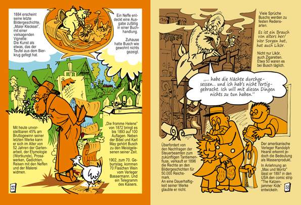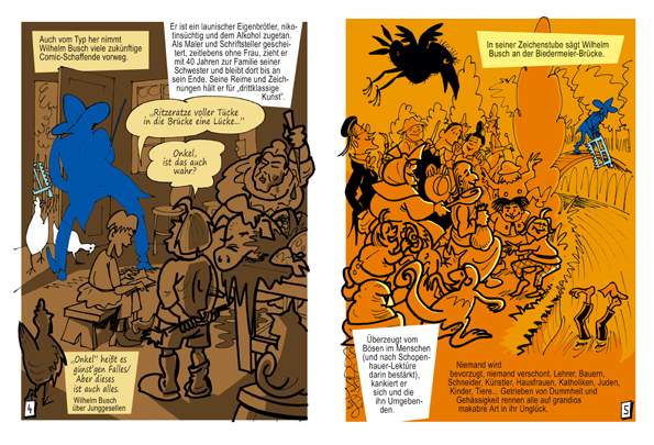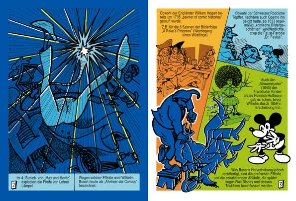 Gleich am Anfang des Comics stellt Willi Blöss klar, dass Wilhelm Busch keineswegs – wie gerne behauptet wird – der Vater des (deutschen) Comics ist. Vor ihm gab es den Engländer William Hogart, den Schweizer Rodolphe Töpffer und auch Heinrich Hoffmanns anti-antiautoritärer “Struwwelpeter“ war bereits erschienen, bevor Wilhelm Busch 1859 innerhalb der “Fliegenden Blätter“ erstmals als komischer Zeichner in Erscheinung trat.